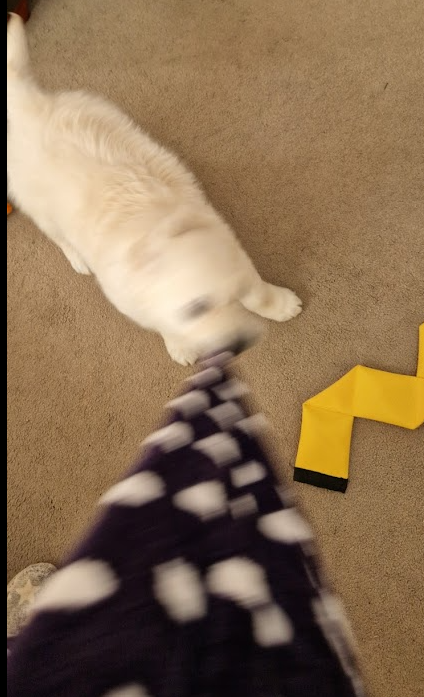I thought I would start the day with a good game, and figured the slightly fluffy dressing gown Mum was wearing looked fun, but after grabbing the bottom of it and shaking it and swing around a bit I heard that strange word "no" again so I pulled a bit more heard the word a few more times but it was great fun, until mum prized the material out of my mouth, she didn't even manage to get a good photo apparently its because I was being a terror.