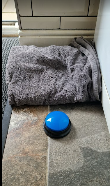 Picture of my Weewee button and my towel to wipe my feet when I come in.