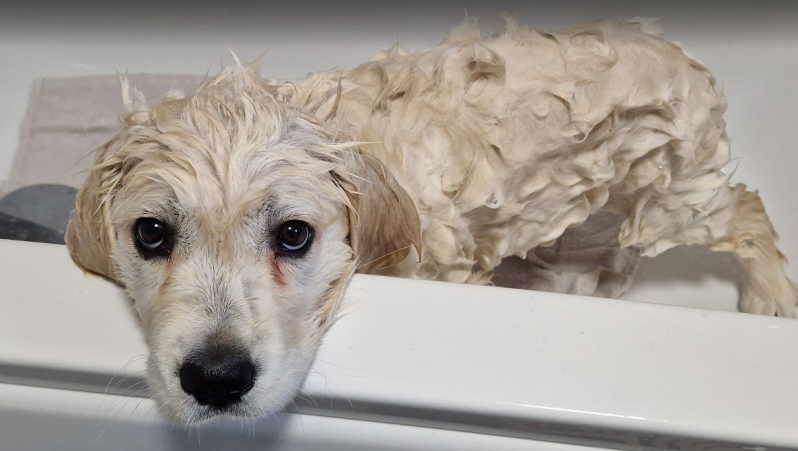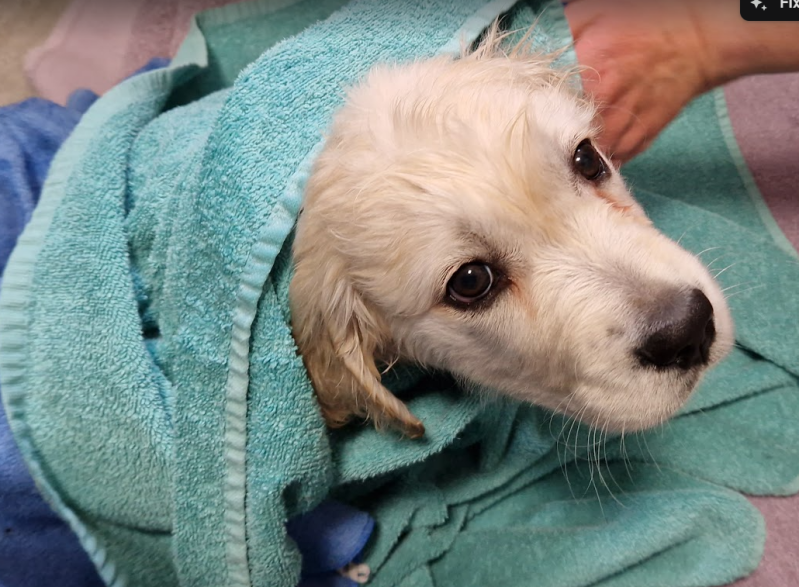 After the vet visit Mum and Dad took me upstairs with they and started get stuff out and putting it in the bathroom, then with no warning the put me in the bath and wet me and lathered me all up no warning or anything, after a good wash and thorough rinse they got me out and tried to towel me dry whilst I tried to escape.